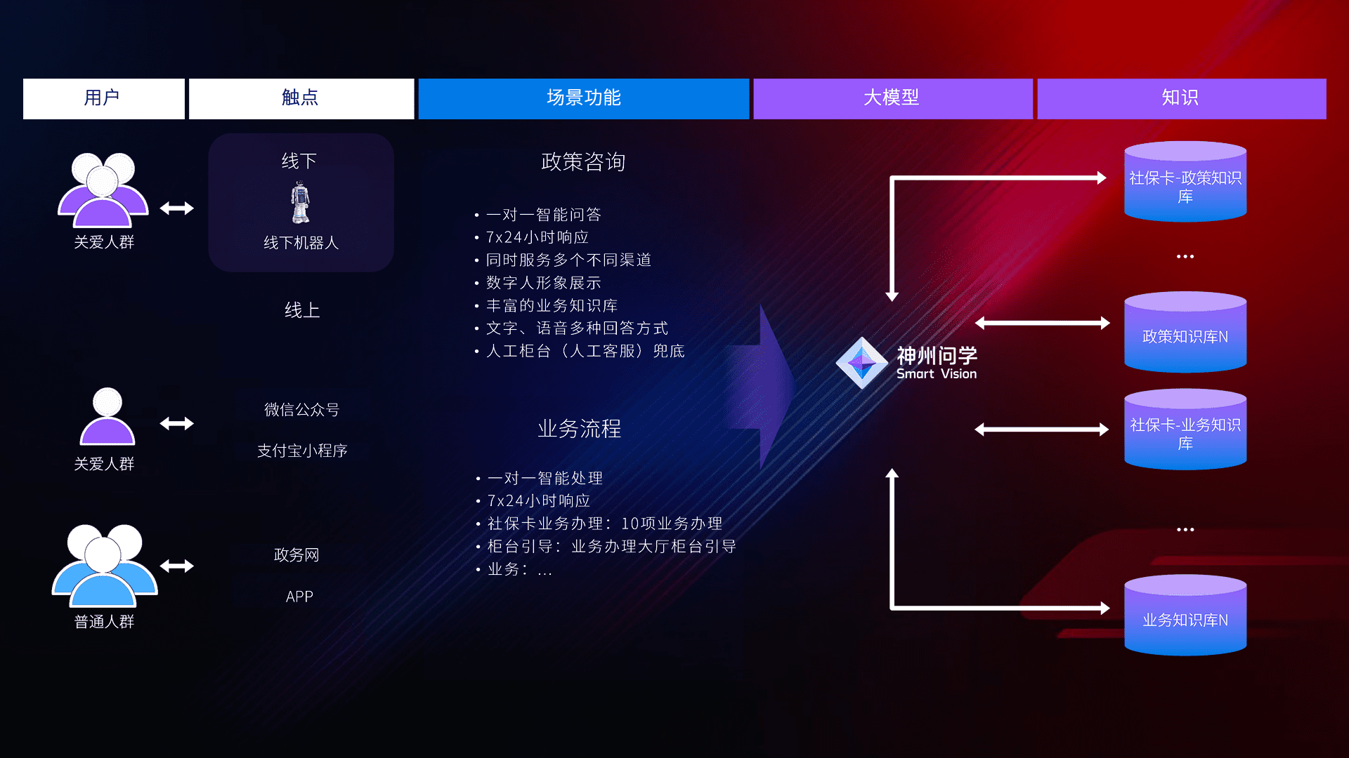 • 线上线下全覆盖:线上提供微信公众号、、、支付宝小程序、、、政务网、、、app多种渠道,,与线下机器人形成完整服务体系。。。。