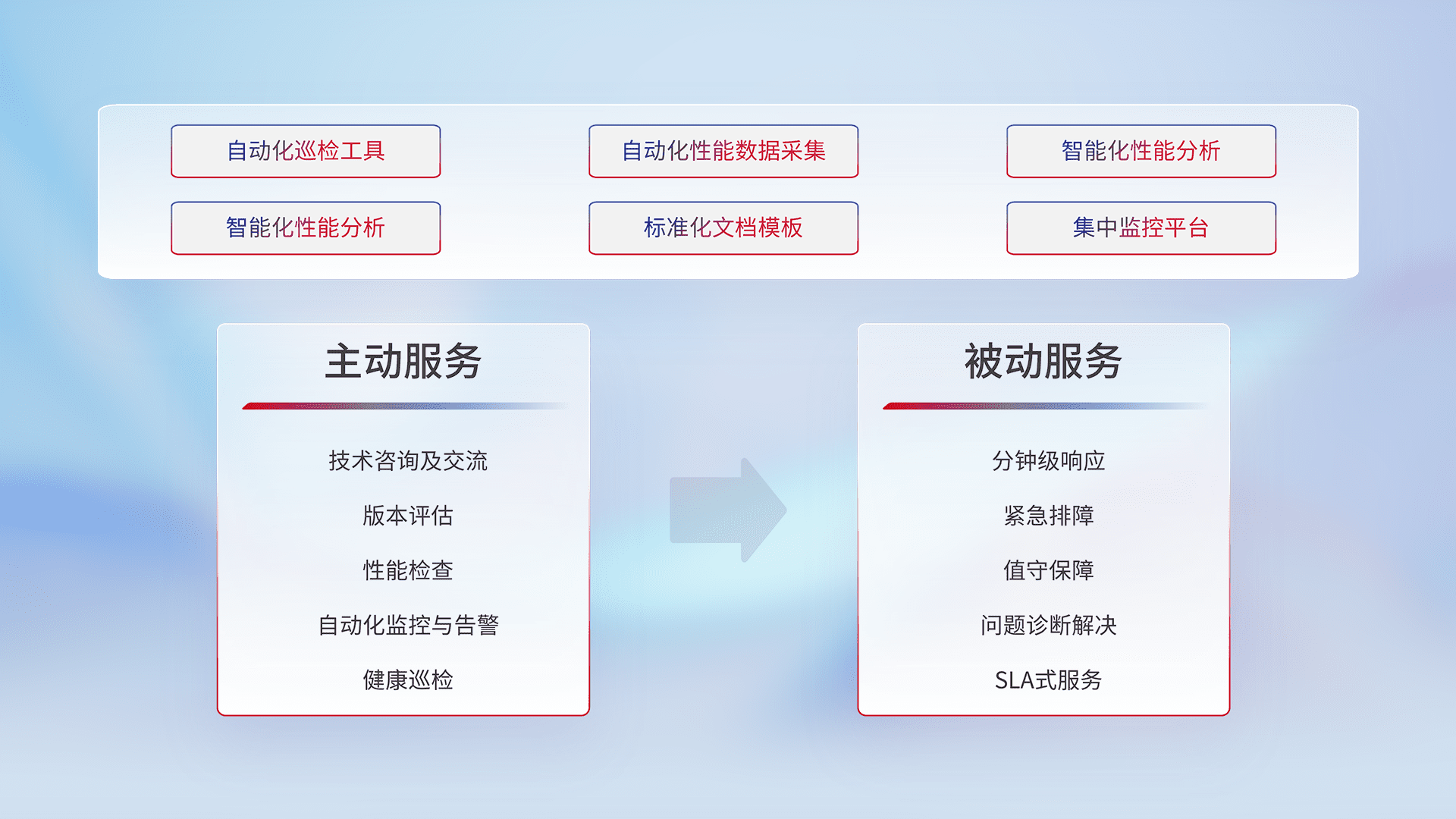 智能化工具和标准化文档,,,,保障服务质量,,,,提供主动服务(包含技术咨询、、、版本评估、、、、性能检查、、、、自动化监控与告警、、、健康巡检)和被动服务包含(分钟级响应、、紧急排障、、、值守保障、、问题诊断解决、、、SLA服务)。。